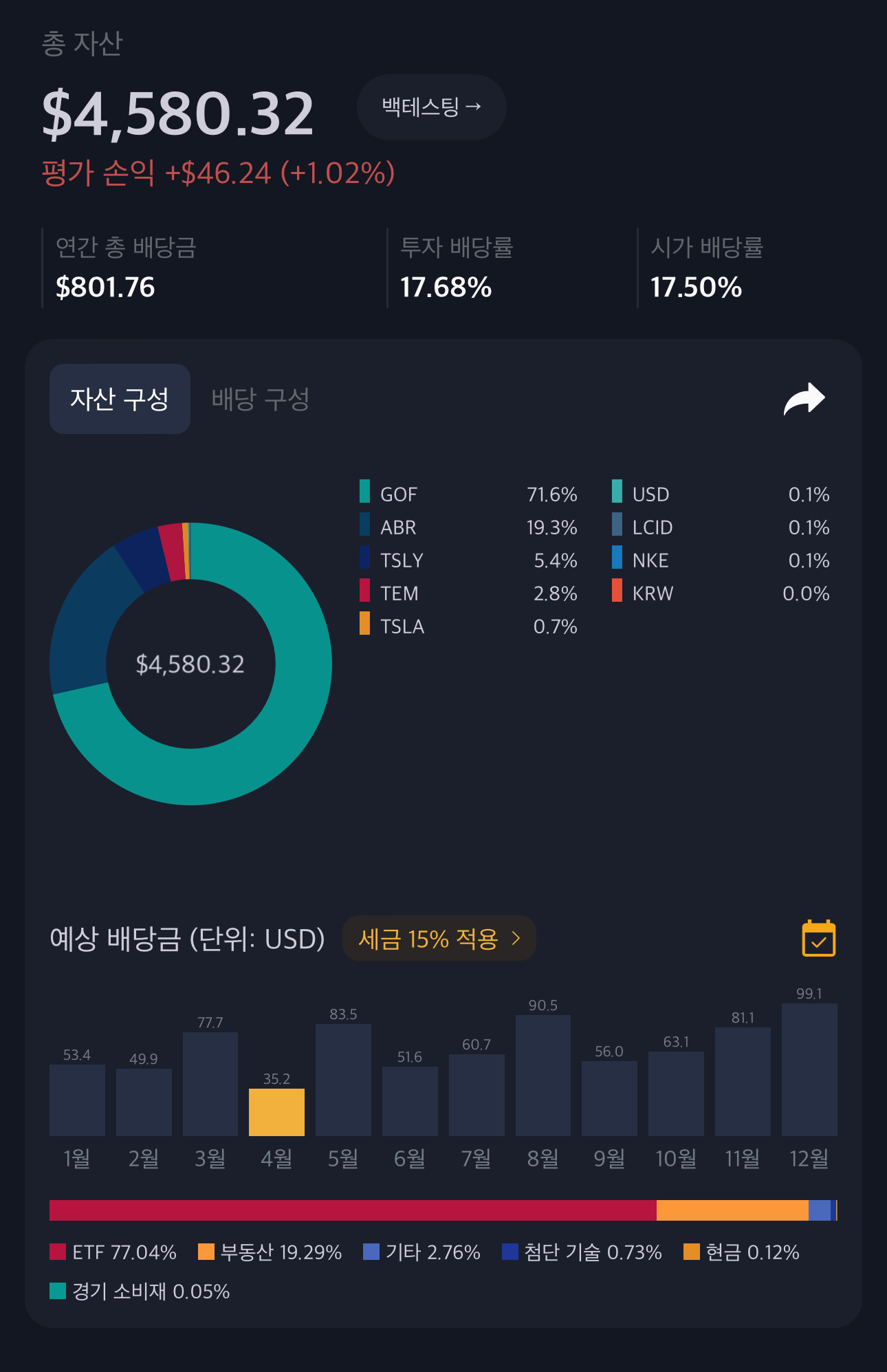 반면, 고배당주는 변동폭이 작고 하락장에서도 배당금을 꾸준히 받을 수 있어, 심리적인 안정감을 주었습니다. 특히 제가 많이 투자한 구겐하임 펀드와 아버 리얼티 트러스트는 박스권 하단에 위치해 있어, 하락장이 와도 급격히 떨어지지 않을 것이라고 생각했습니다. 다행히 최근 하락장에서 제 예상이 어느 정도 맞아떨어졌습니다. 기술주들이 큰 폭으로 하락할 때, 고배당주들은 상대적으로 괜찮은 방어력을 보여주었습니다.