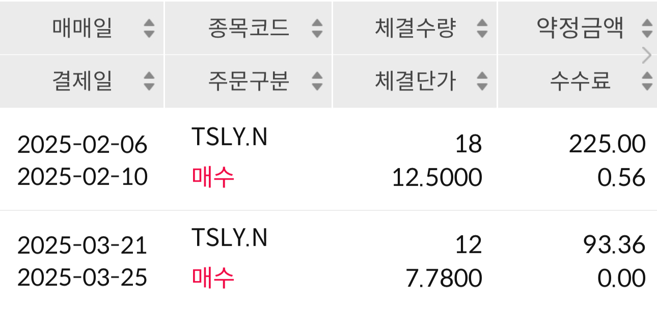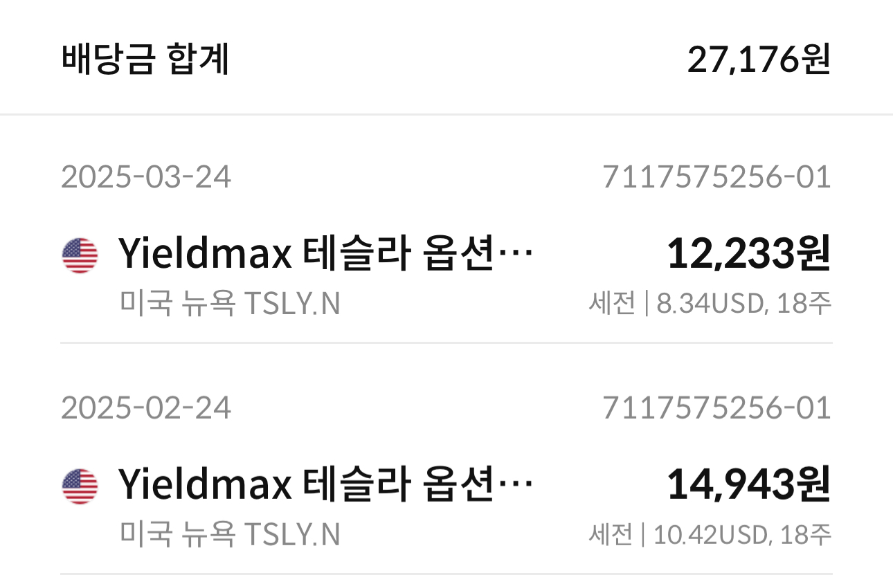 그래서 호기롭게 30만 원으로 TSLY를 매수했습니다. 18주 기준 첫 배당금은 세후 약 12,000원, 두 번째는 10,398원이 들어왔습니다. 배당만 보면 꽤 만족스러웠지만, 문제는 주가였습니다. 4월 12일 기준 TSLY는 약 30% 하락했습니다. 저는 약 9만 원의 손실을 본 상태에서 3월 21일에 11만 원을 추가로 매수해 총 40만 원을 투자하게 되었습니다.